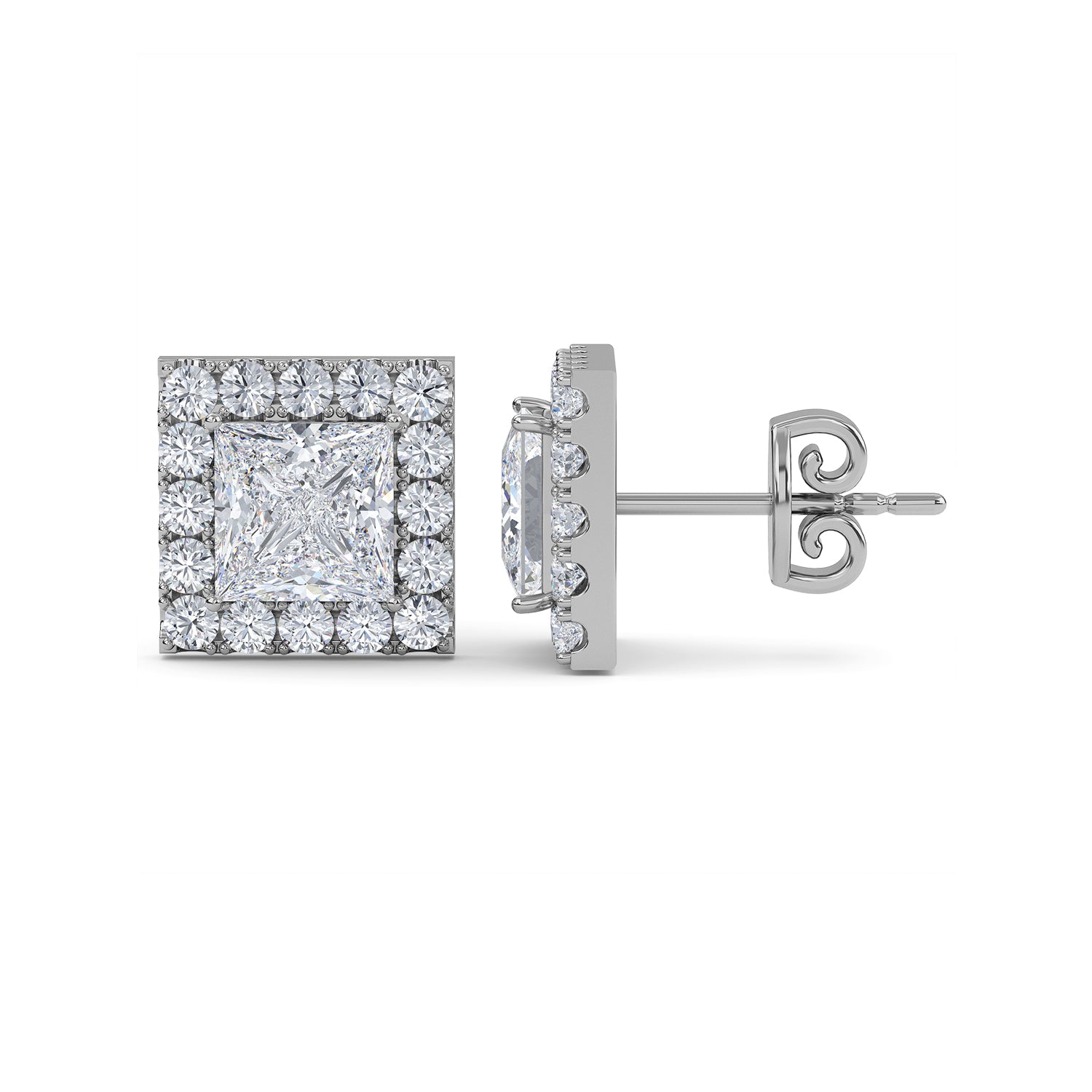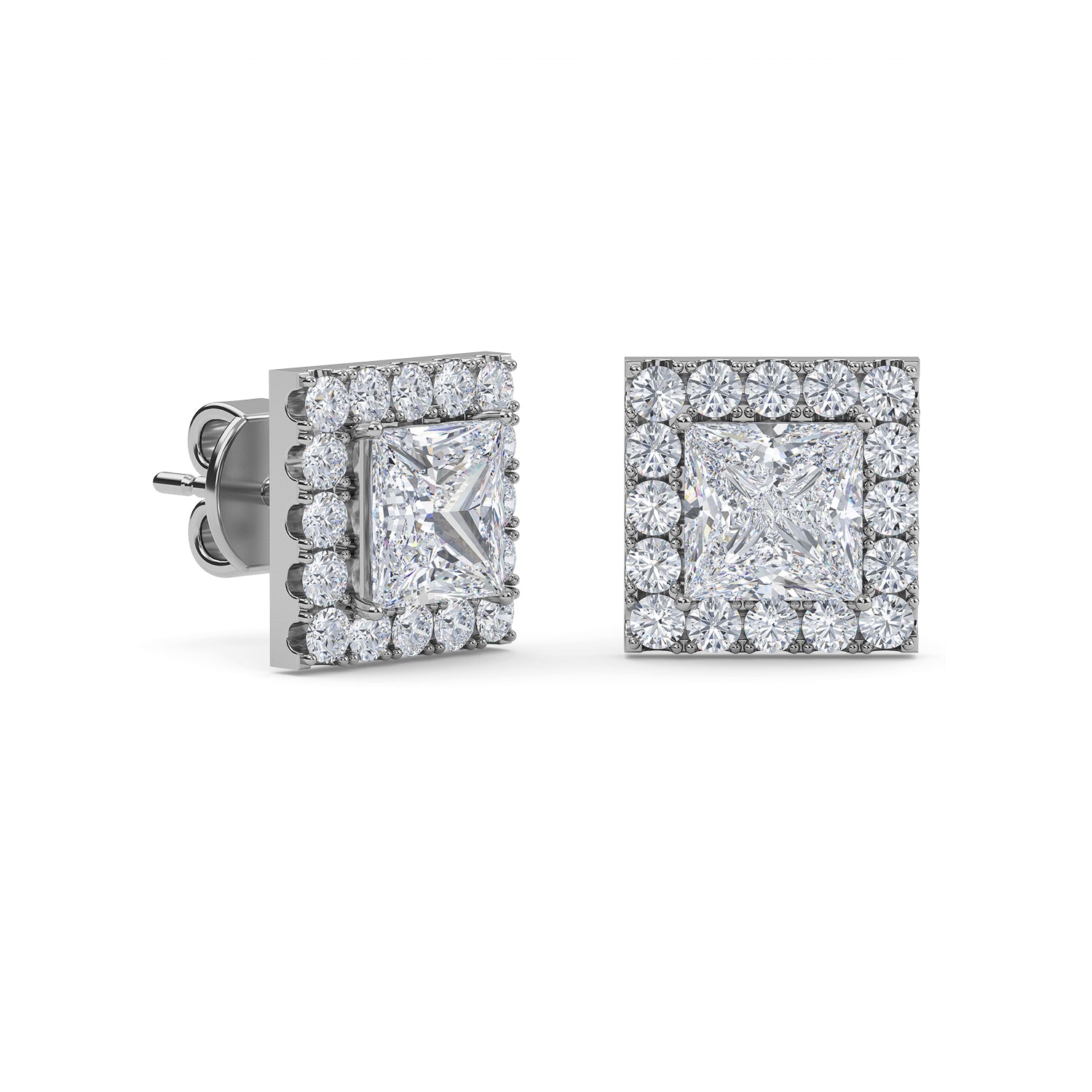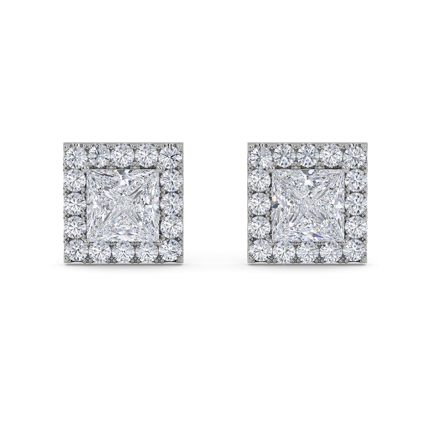 These beautiful earrings feature a matched pair of princess cut diamonds surround by dazzling round daimond halo that wraps the gem and gives stunning look.