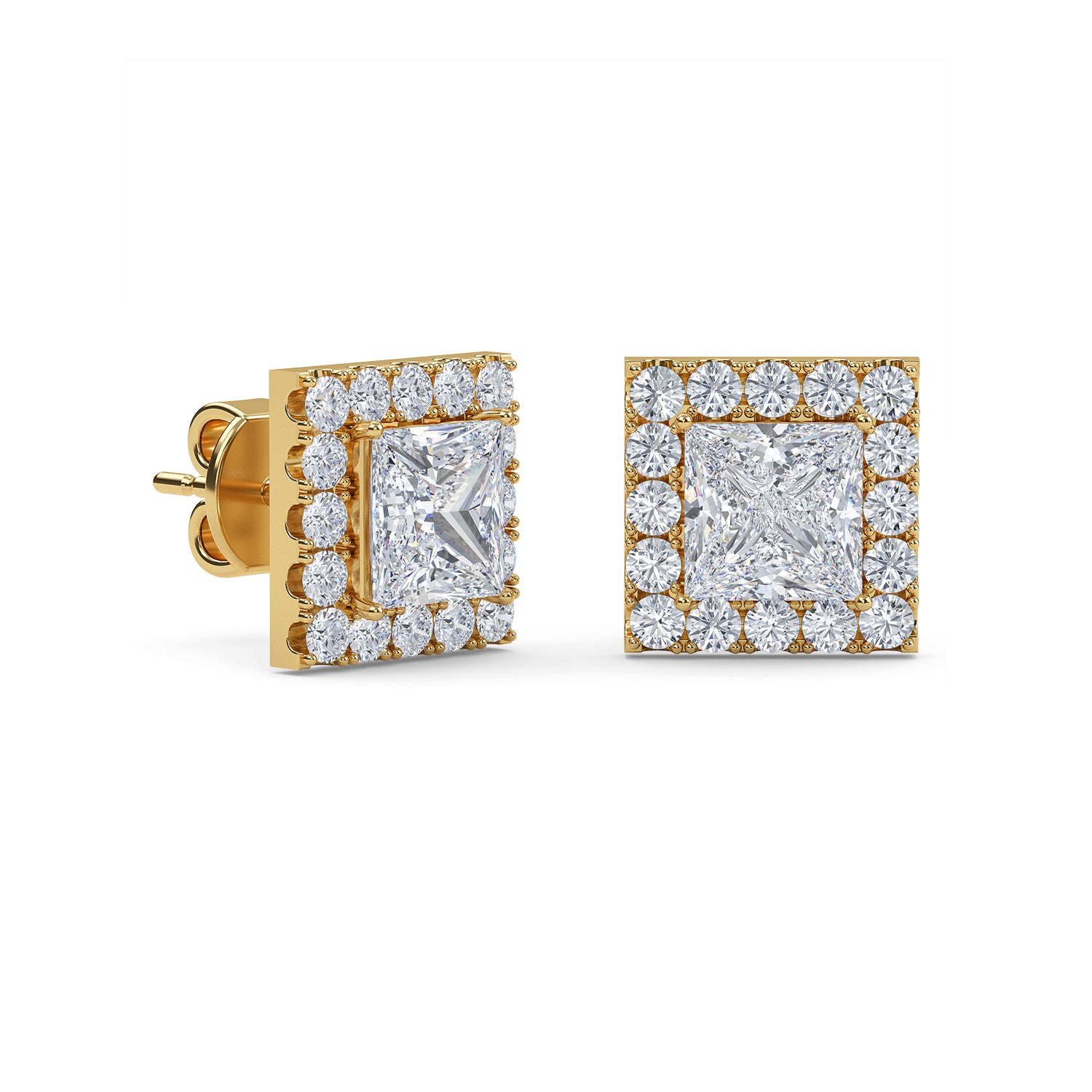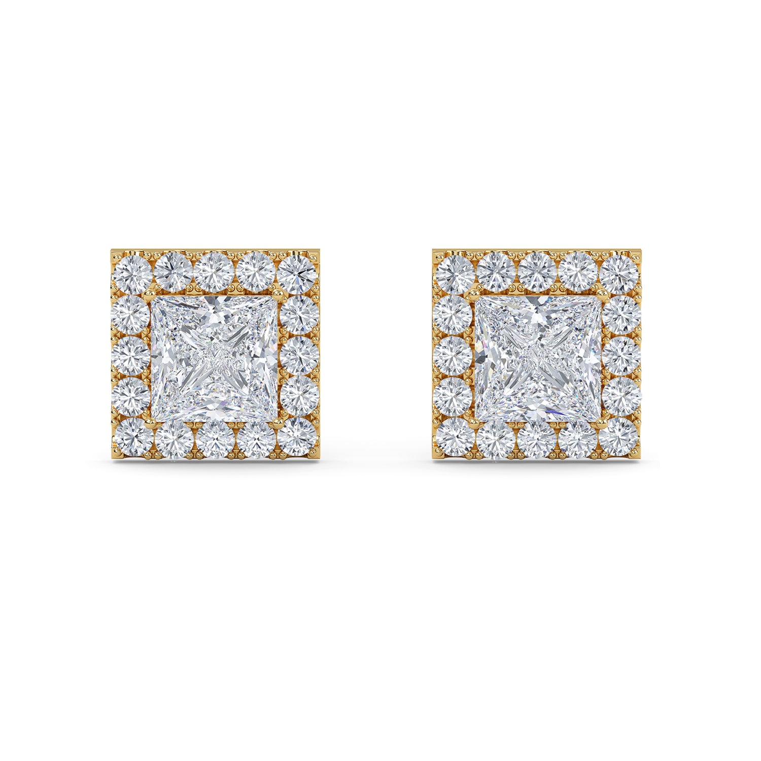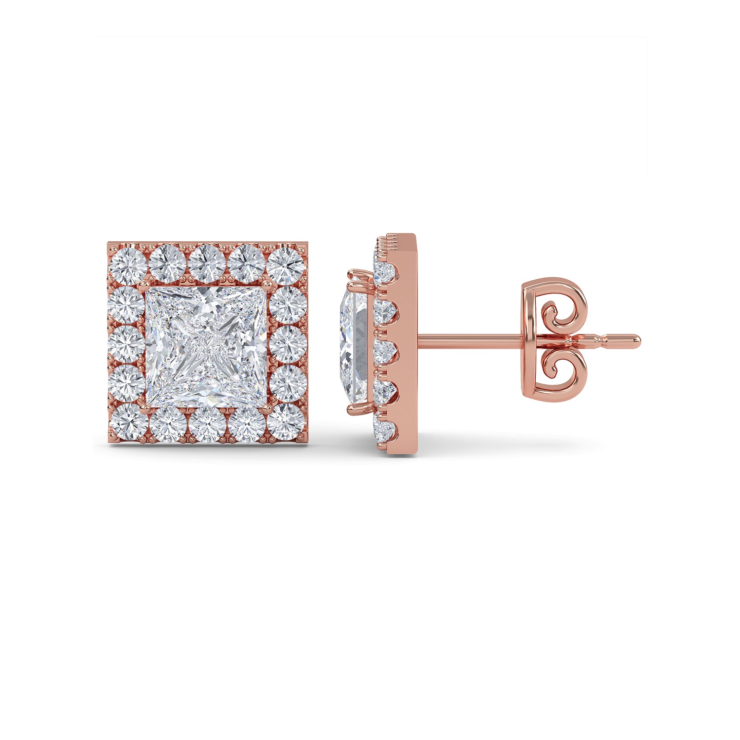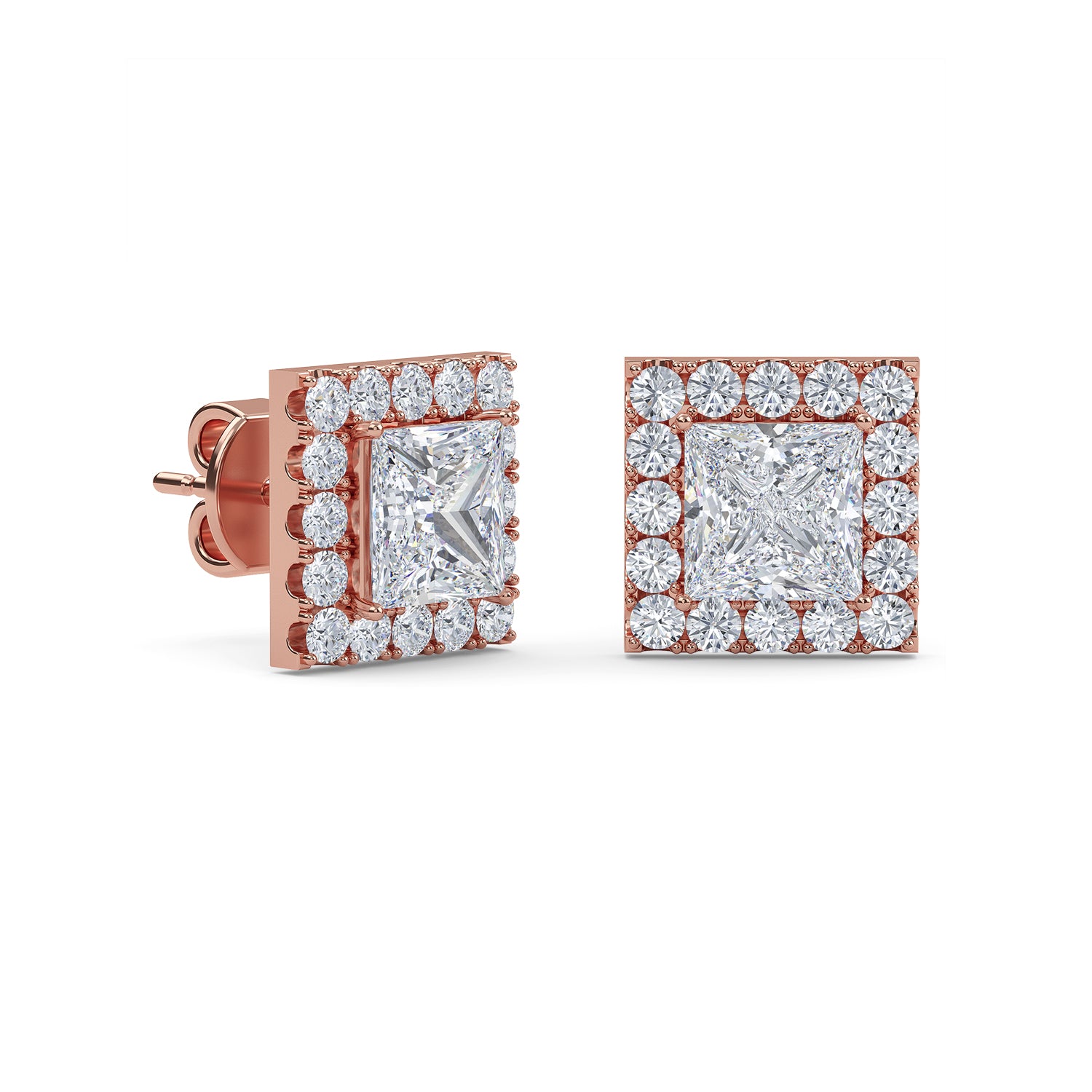 These beautiful earrings feature a matched pair of princess cut diamonds surround by dazzling round daimond halo that wraps the gem and gives stunning look.