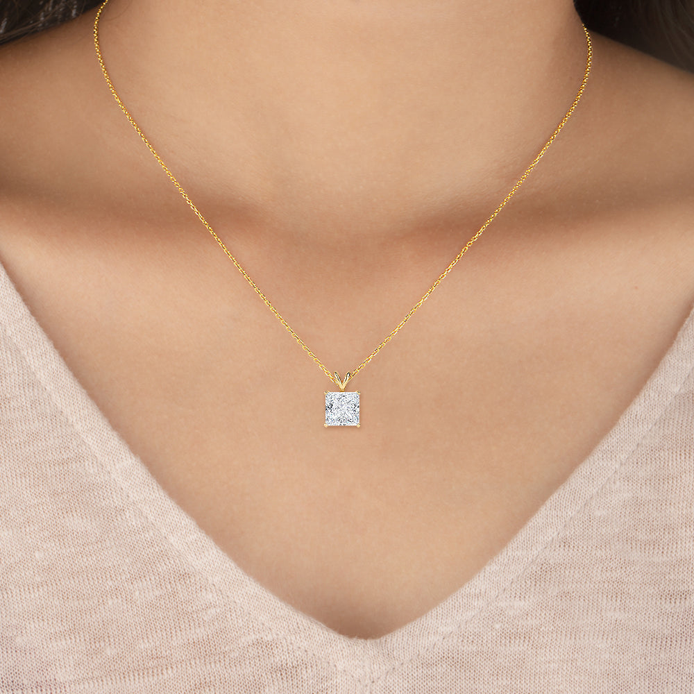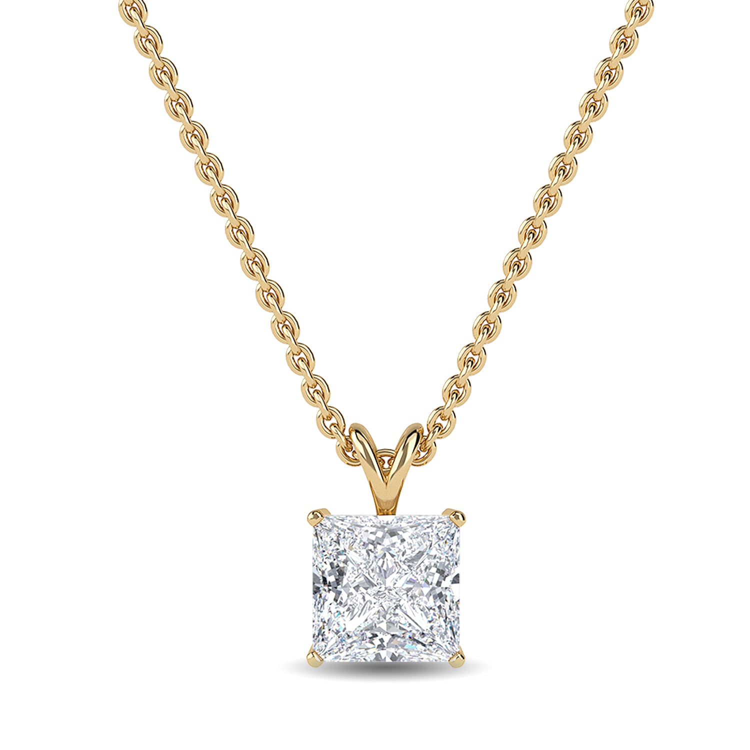 Adorn yourself with our Isla Princess Diamond Pendant, a timeless piece crafted from 18k gold and featuring a four prong setting. This elegant design is luxuriously complemented by an 18 inch cable style lobster clasp gold chain. Exude elegance and grace with this sophisticated, exclusive necklace.