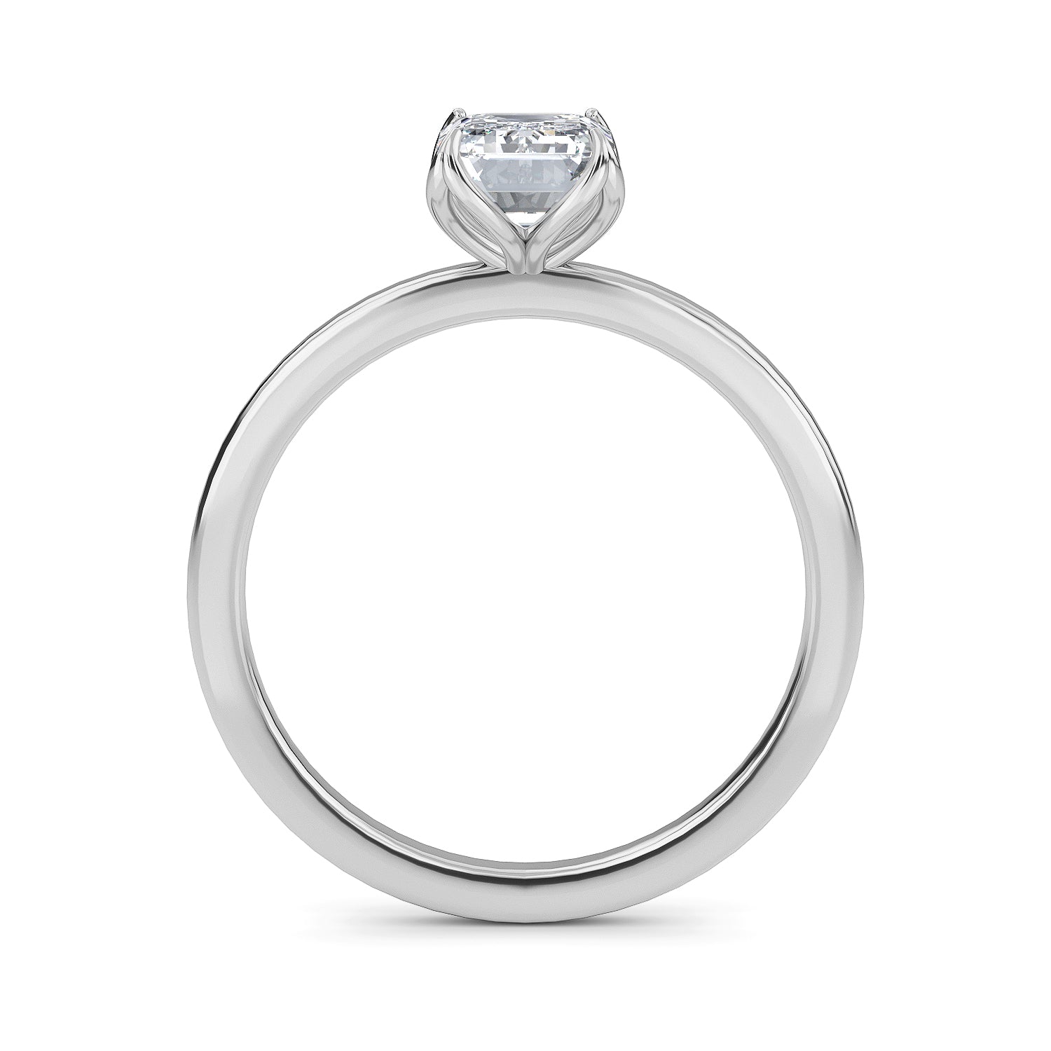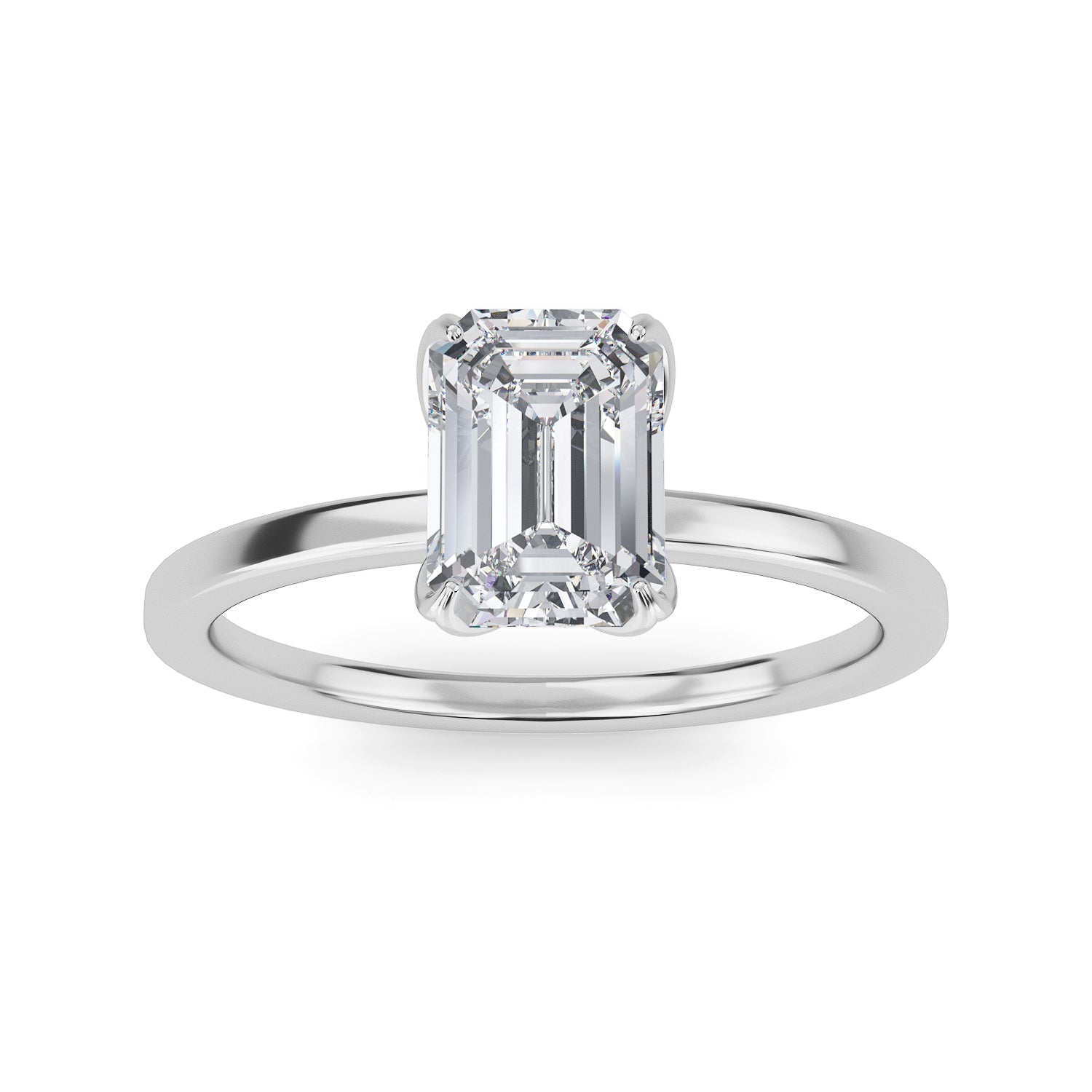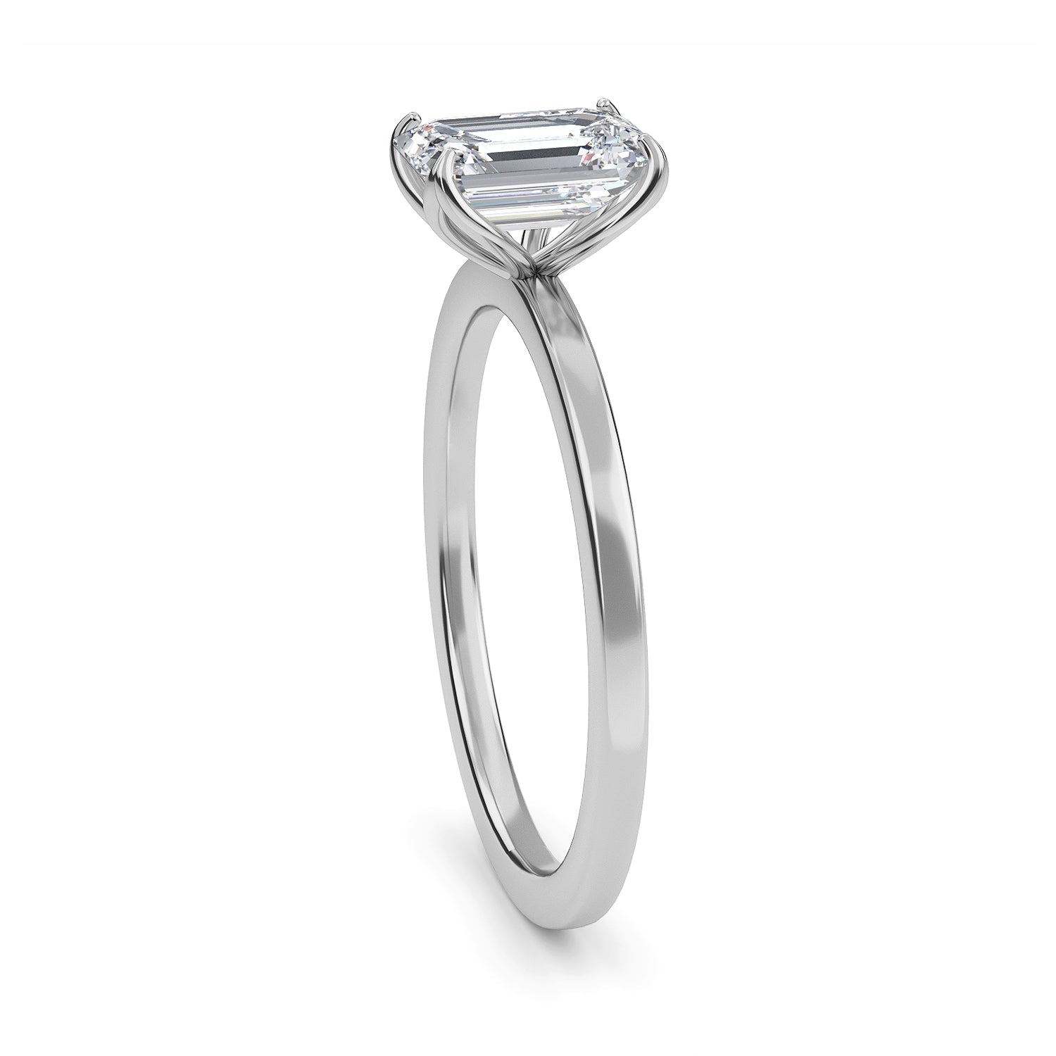 This exquisite diamond engagement ring, Marseille, is the definition of elegance with its emerald cut center stone twinkling in a four prong setting, carefully nestled within a delicate 1.8mm band. A timeless classic, this ring is sure to bewitch you with its captivating sparkle.