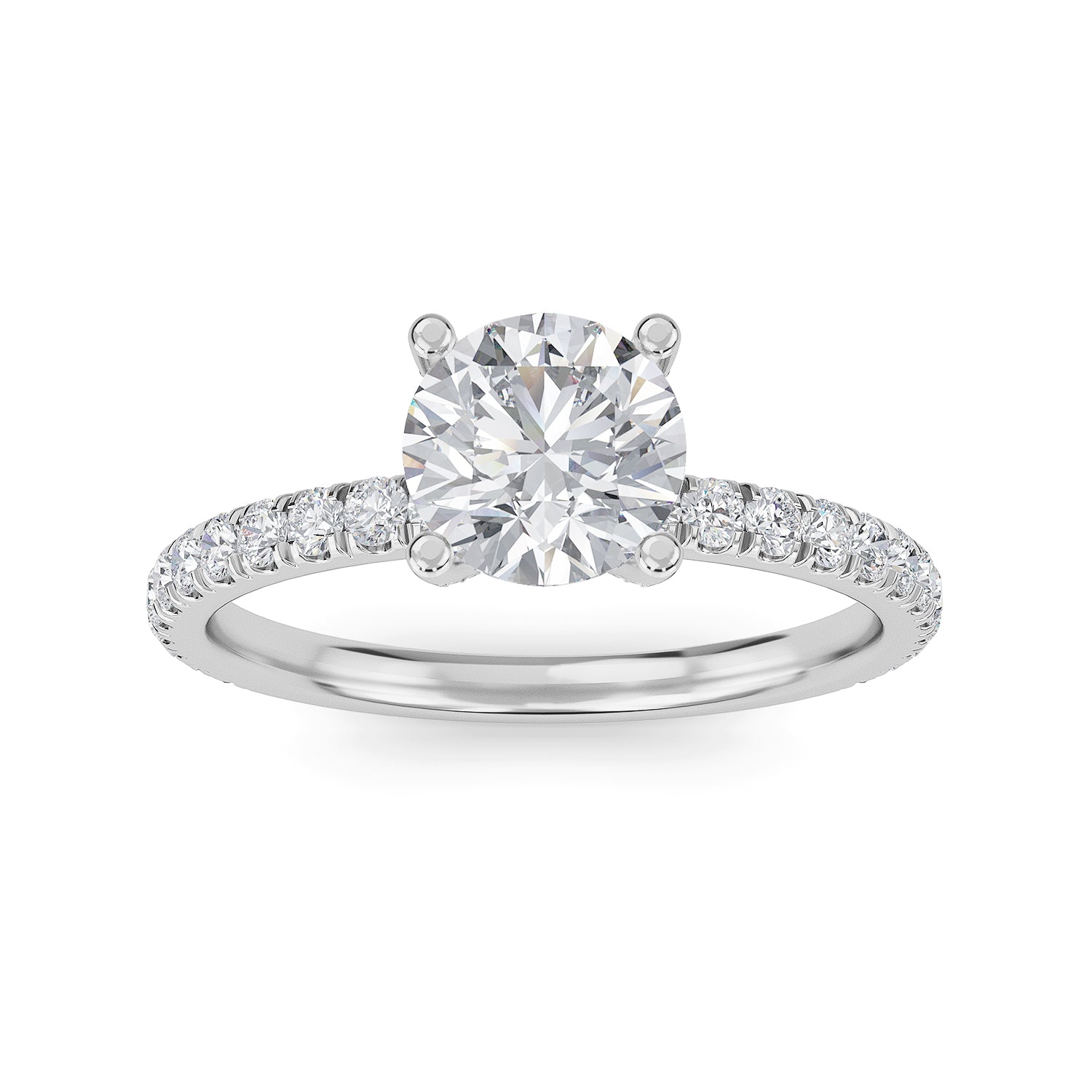 This perfect fit engagement ring is a timeless beauty, with a 1.8mm diamond-studded band and a round brilliant cut center stone. Its hidden accents lend the piece a subtle elegance that will last for years to come. A stunning symbol of true love, this ring is perfect for the one you adore.