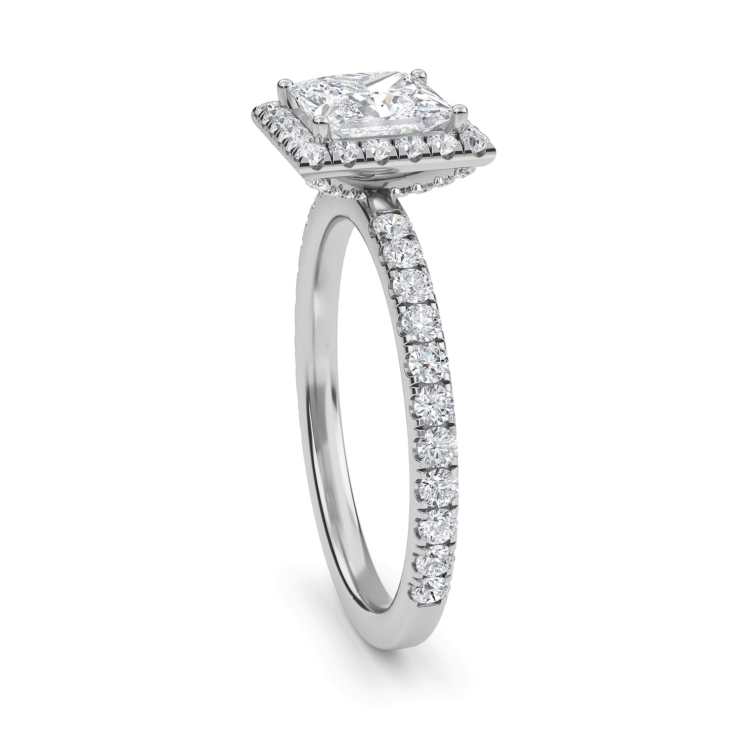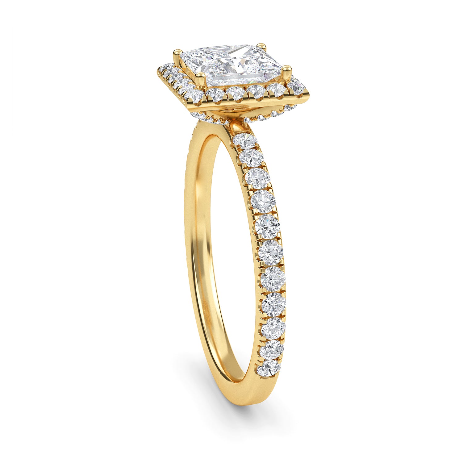 Our Fancy Halo is a truly luxurious adornment perfect for any occasion. This stunning ring features a 2.2mm diamond encrusted band, a princess cut center stone, and hidden accents all crafted to perfection. Whether treating yourself or a beloved, this ring is sure to make a lasting impression.