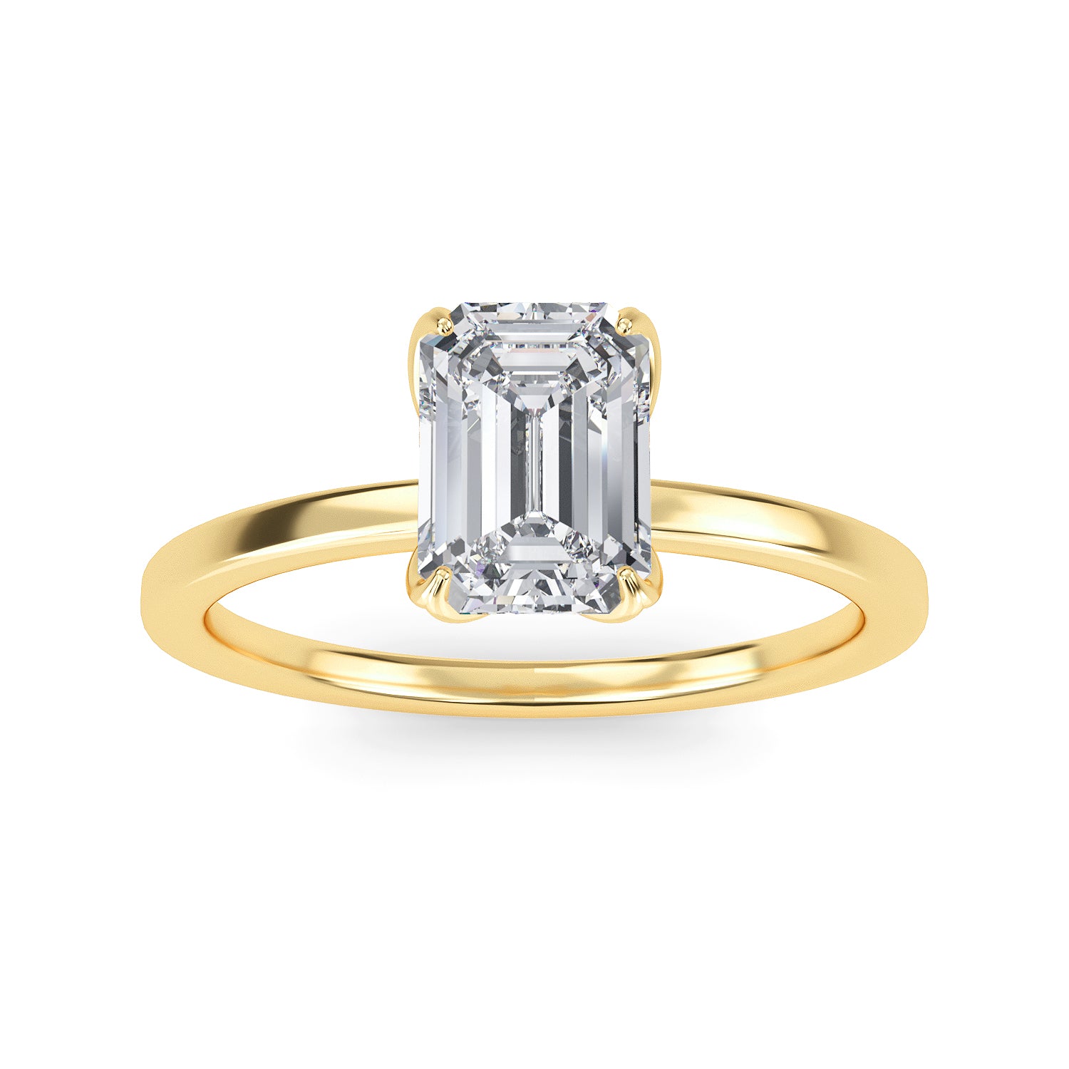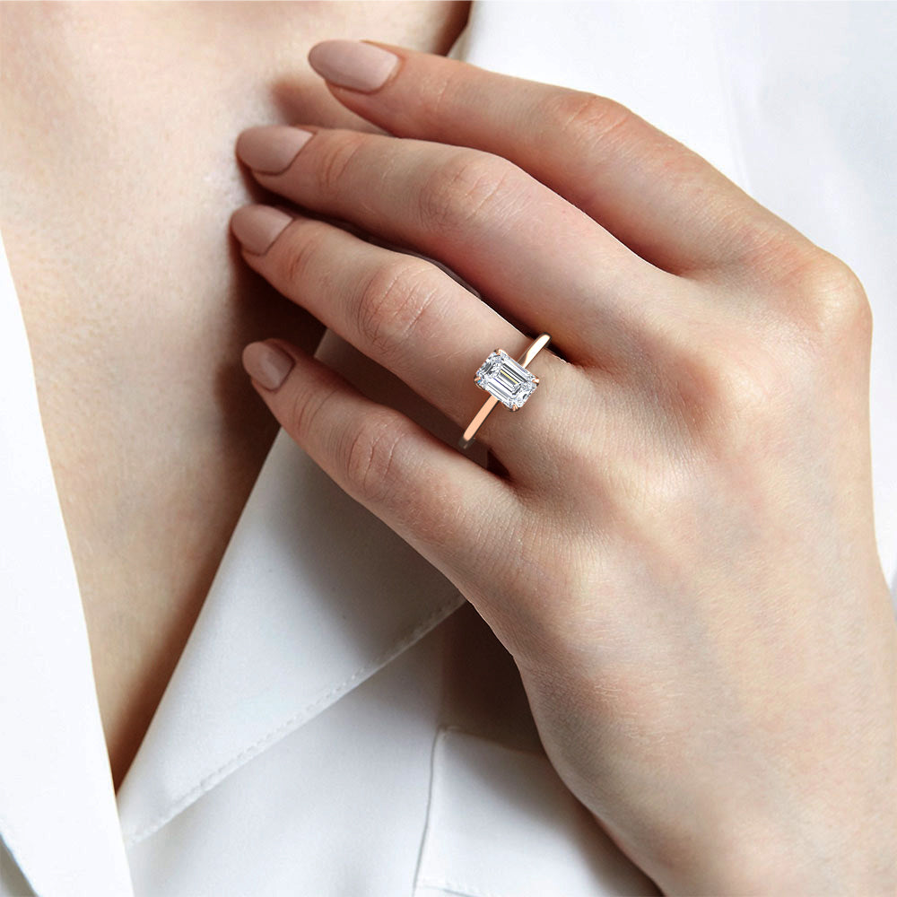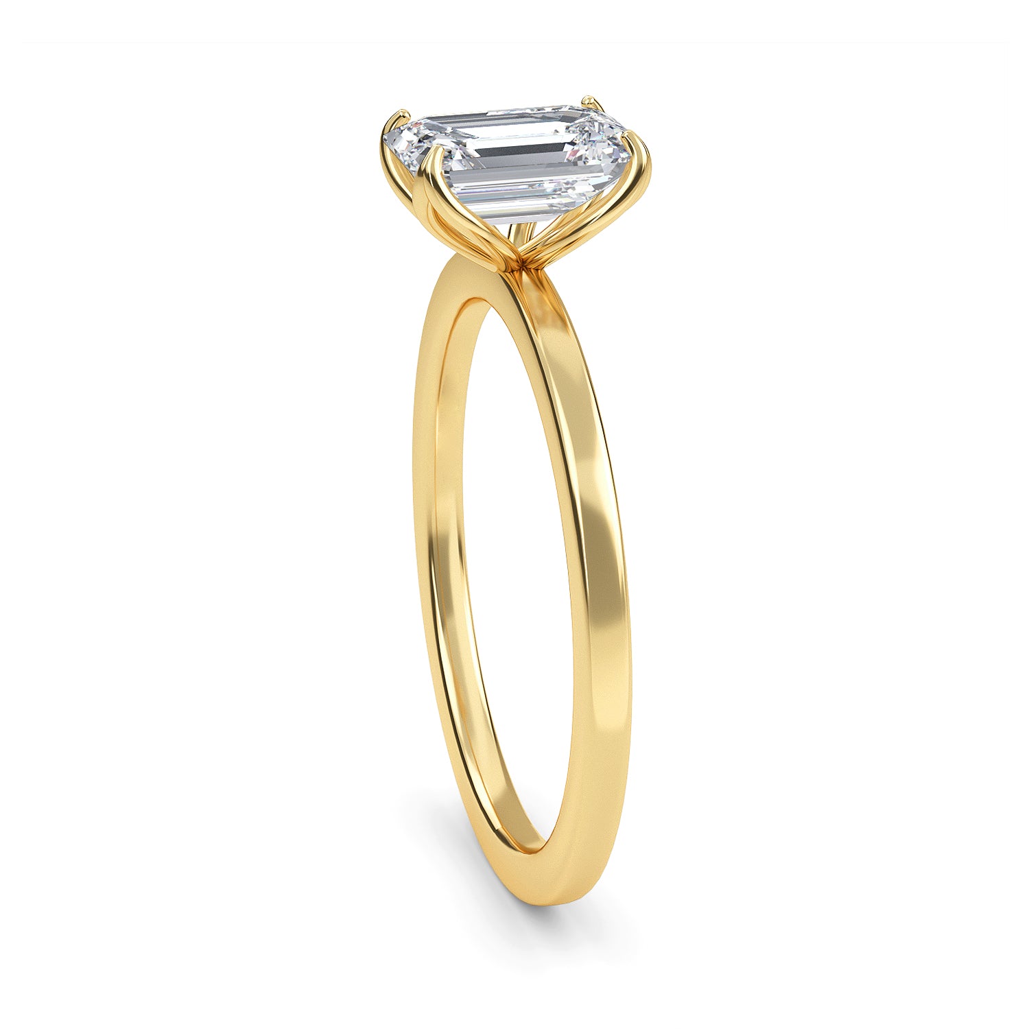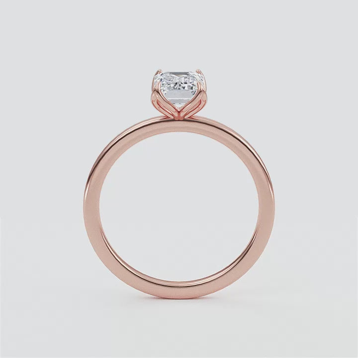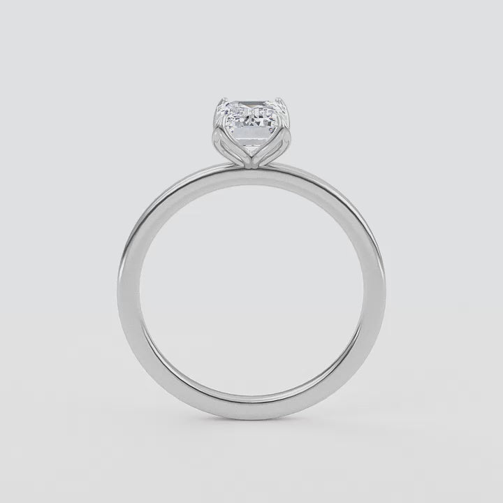 This exquisite diamond engagement ring, Marseille, is the definition of elegance with its emerald cut center stone twinkling in a four prong setting, carefully nestled within a delicate 1.8mm band. A timeless classic, this ring is sure to bewitch you with its captivating sparkle.