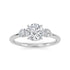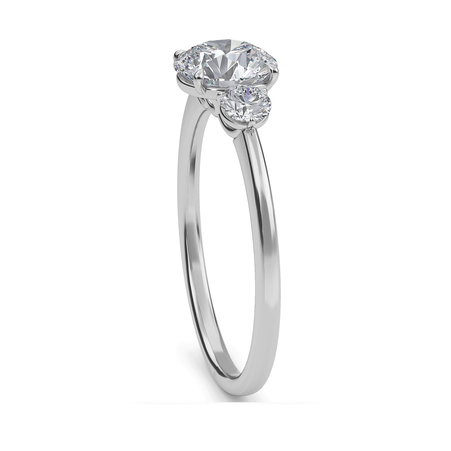 Introducing Daisy, the perfect combination of modern elegance and timeless class. This exquisite three stone ring, featuring a round center stone, and two round diamond accents, is crafted from a delicate 1.8mm tapering band, offering understated beauty and sophistication.