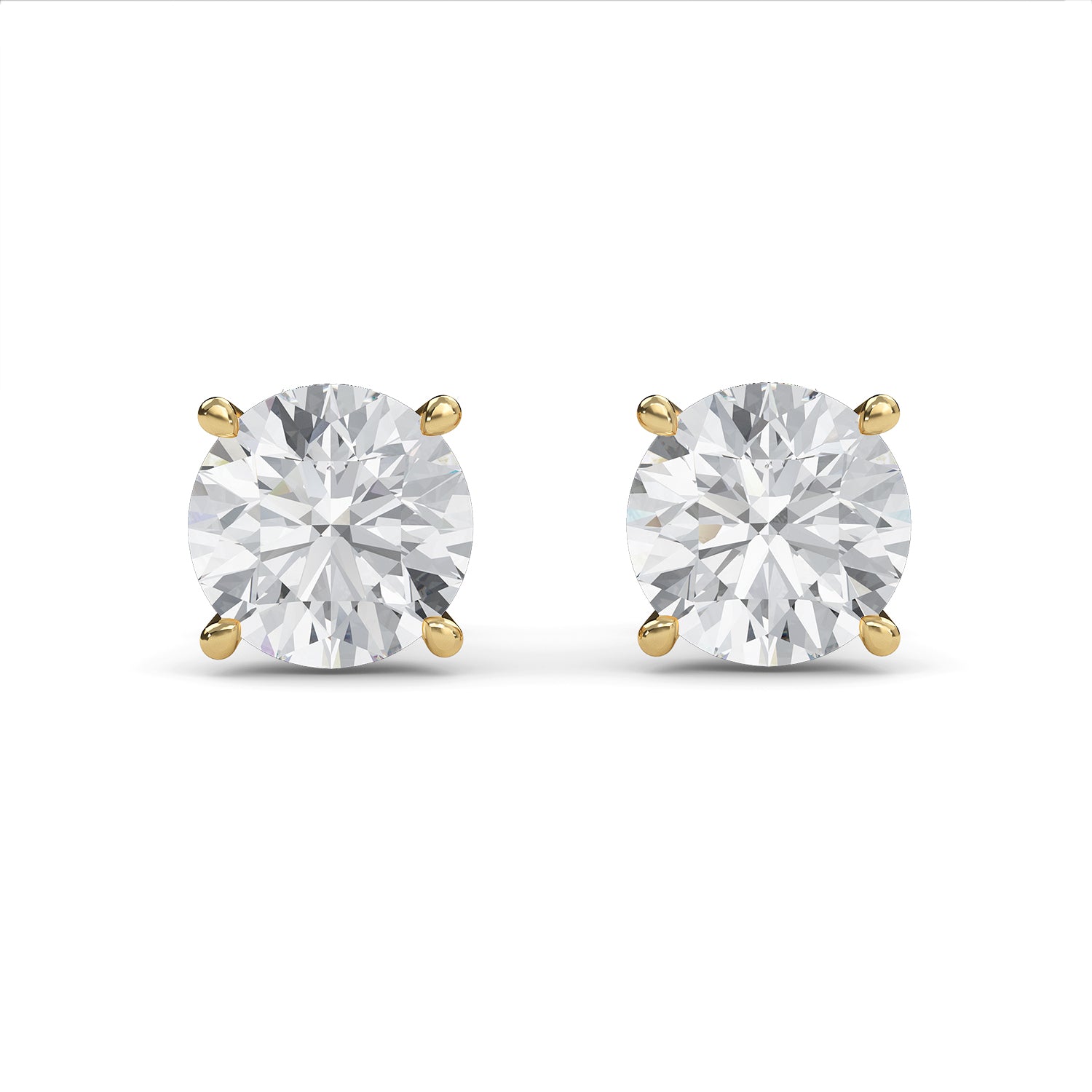 Each earring prominently features a round cut diamond in a bright hue, lending it a pure and timeless look.