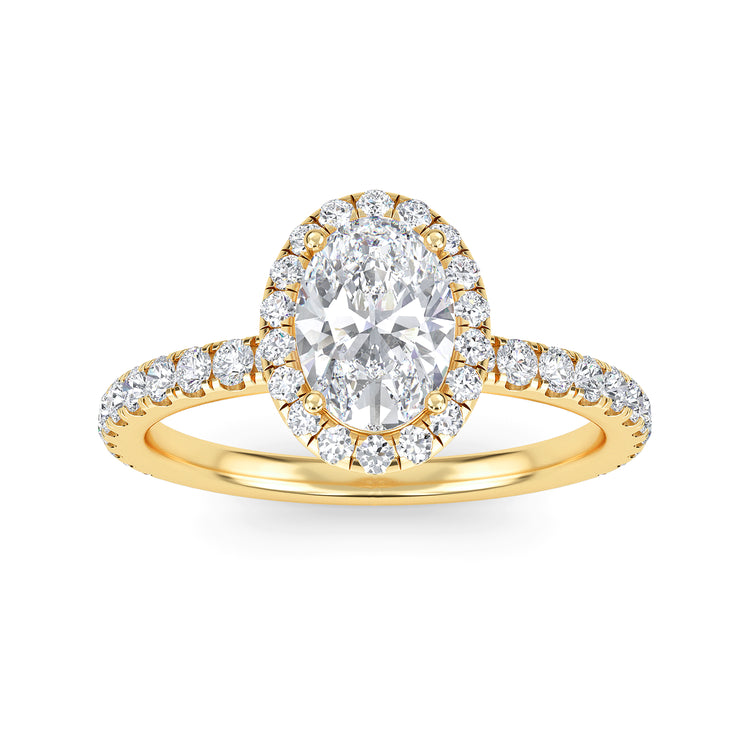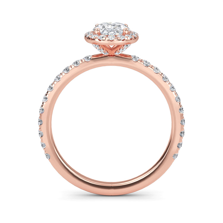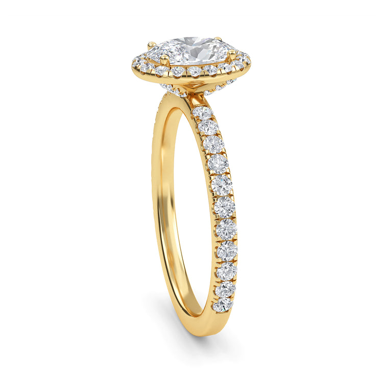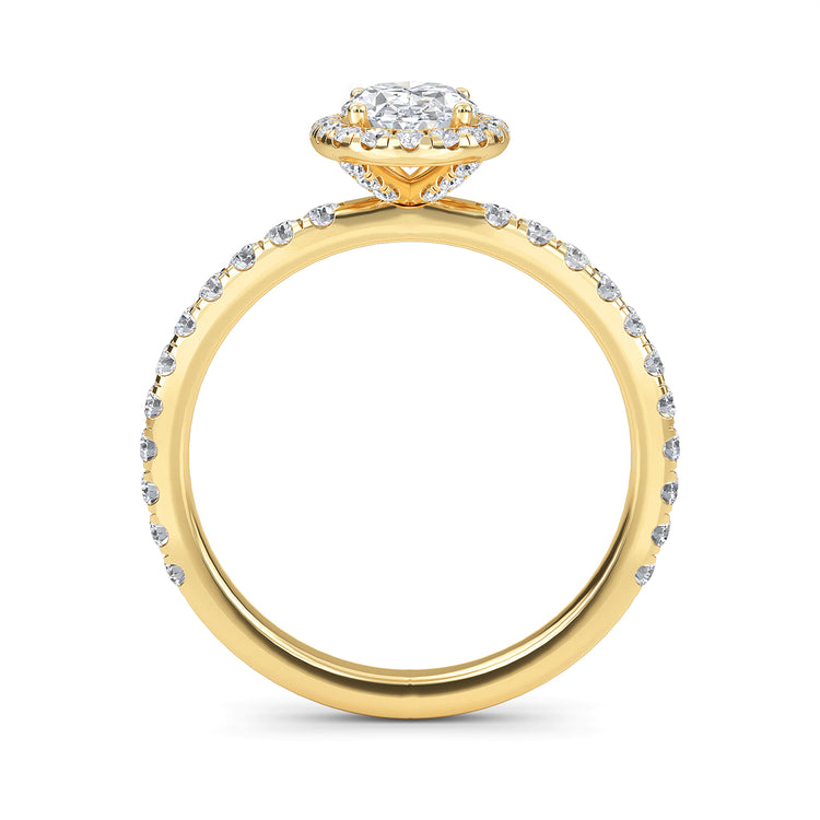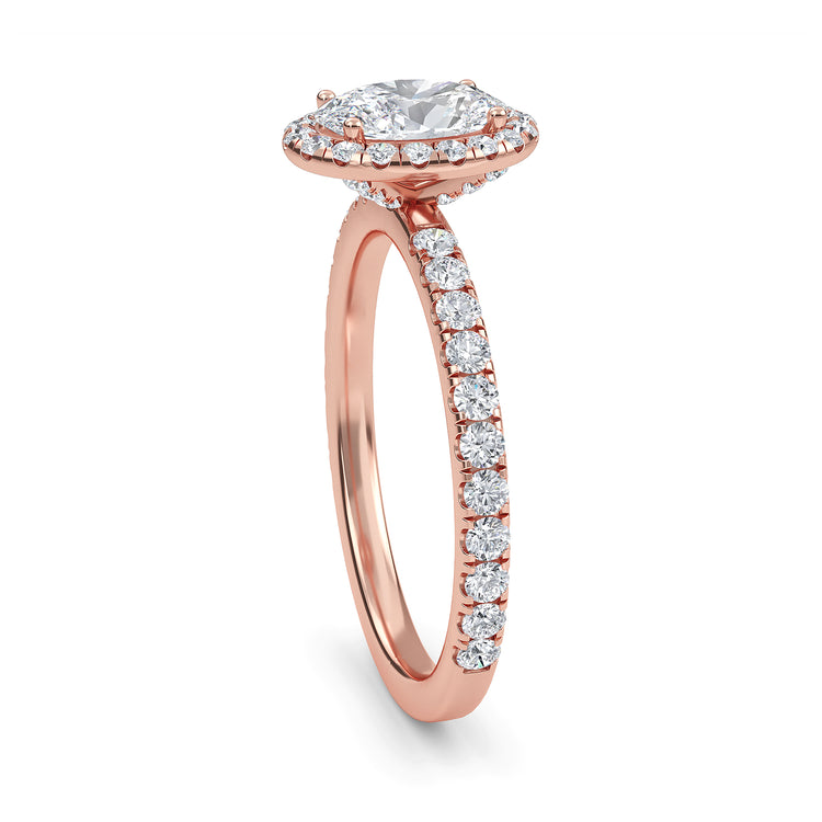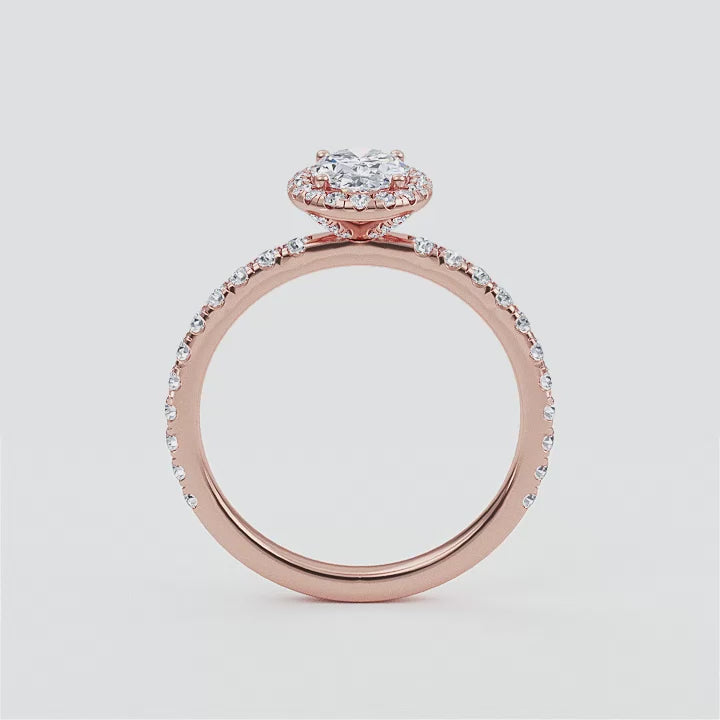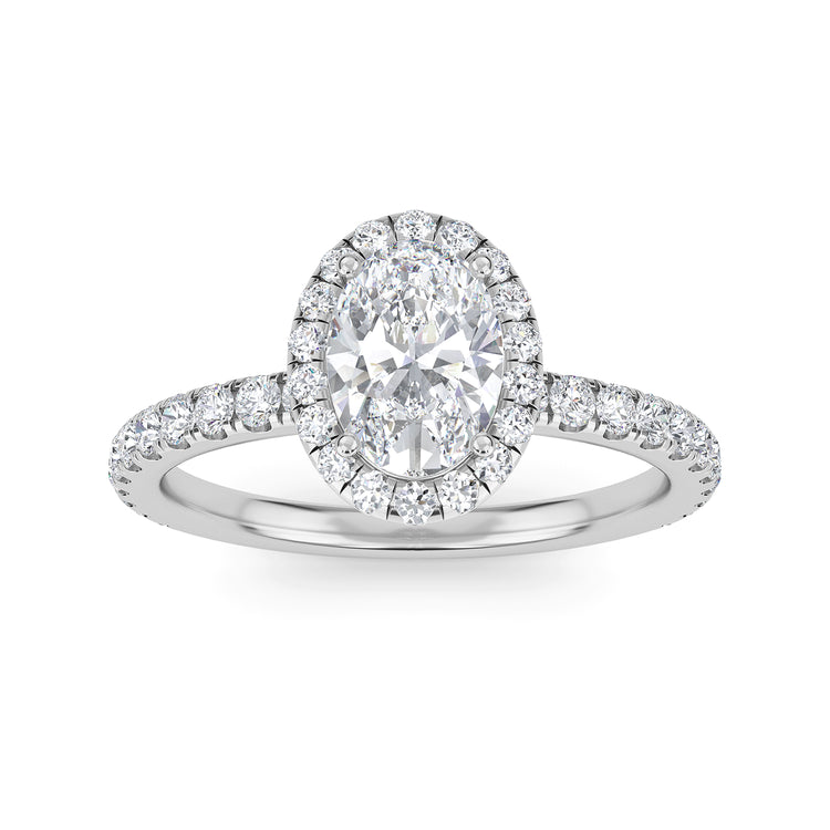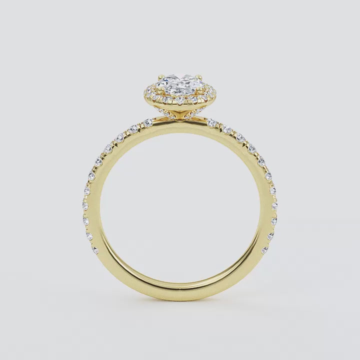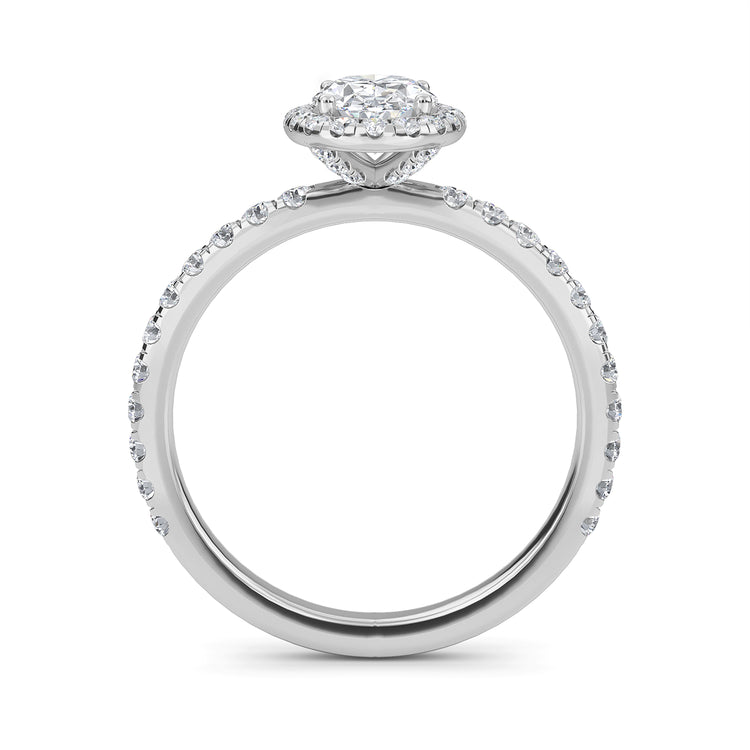 Adorn your finger with exquisite elegance with our Camellia ring. This stunning piece of jewelry features a timeless oval cut diamond center stone, surrounded by an alluring halo of sparkling diamonds, a diamond band, and hidden accents that give it an extra special touch. Crafted with a 2.2mm band and a luxurious feel, this ring will draw eyes and envy everywhere you go.