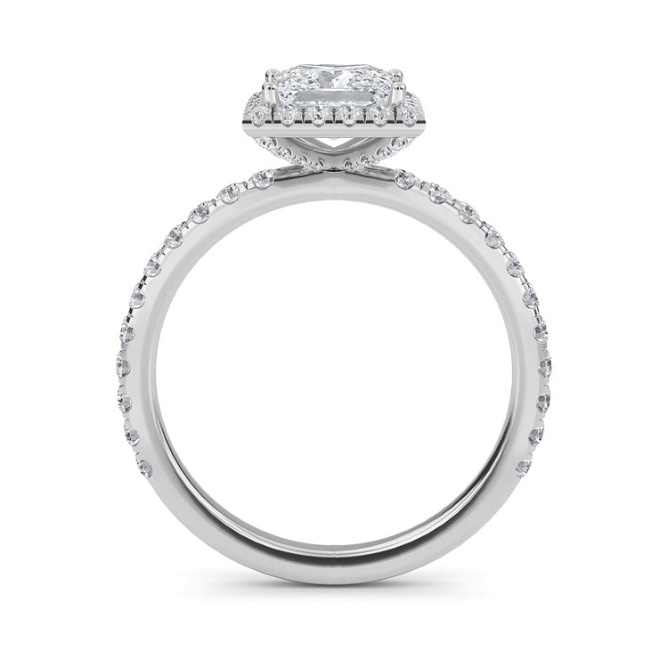Behold the resplendent beauty of the Elegant Halo ring, an exquisite masterpiece that radiates brilliance. At its heart lies a magnificent emerald-cut center stone, elevating it to the status of an actual dazzling work of art.