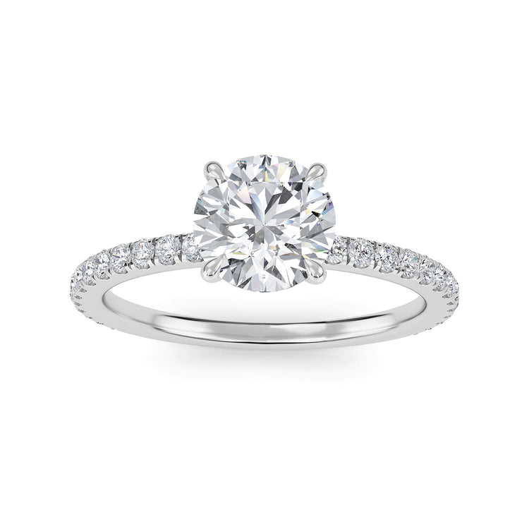 A timeless classic, the Valencia sparkles with brilliance, boasting an 1.8mm diamond studded band and a round brilliant cut center stone that exudes glamour, luxe and romance. The perfect engagement ring for a sophisticated, modern bride.