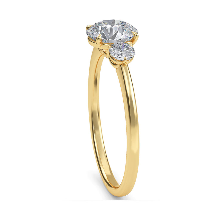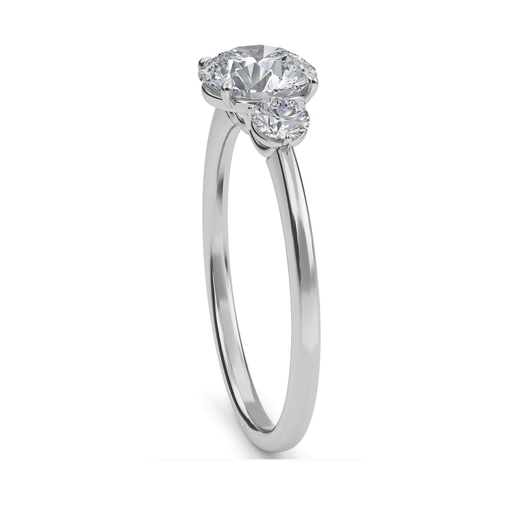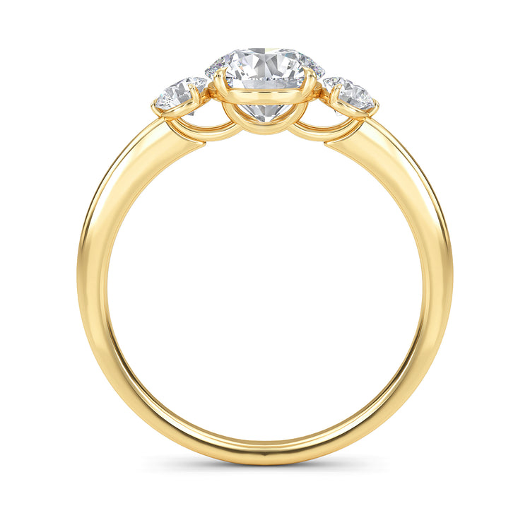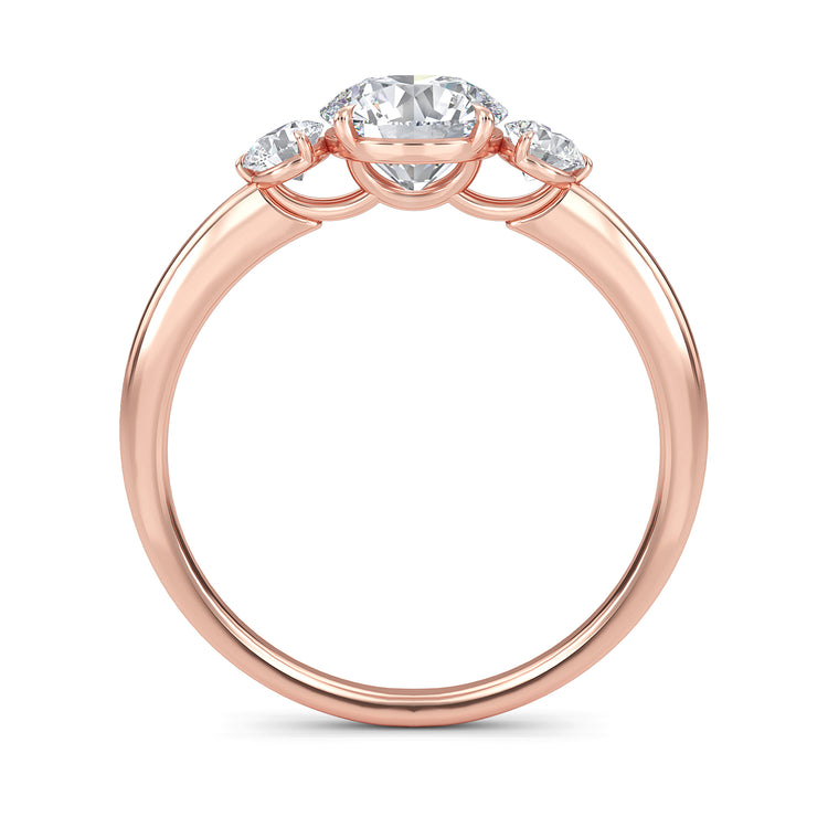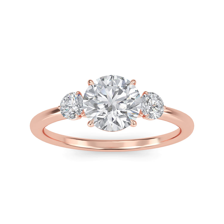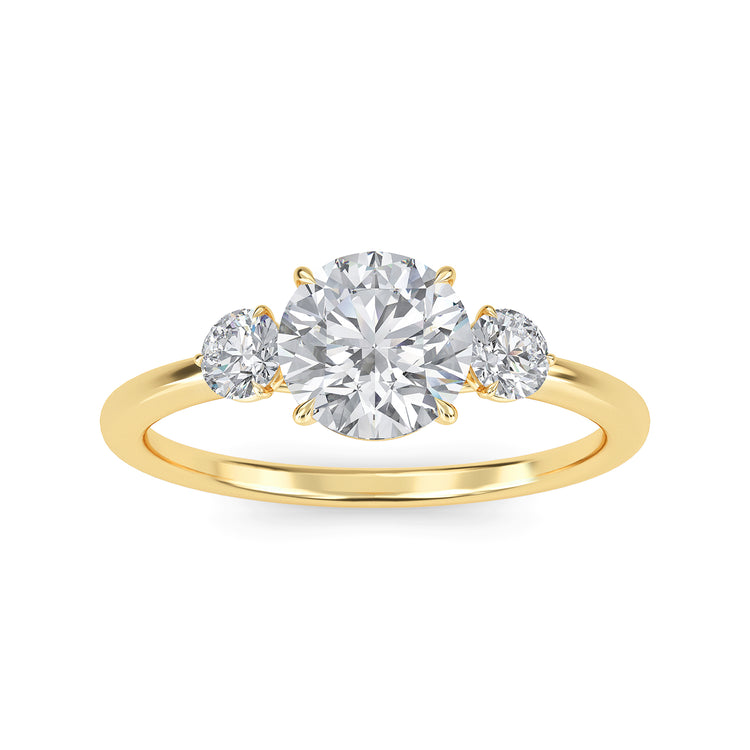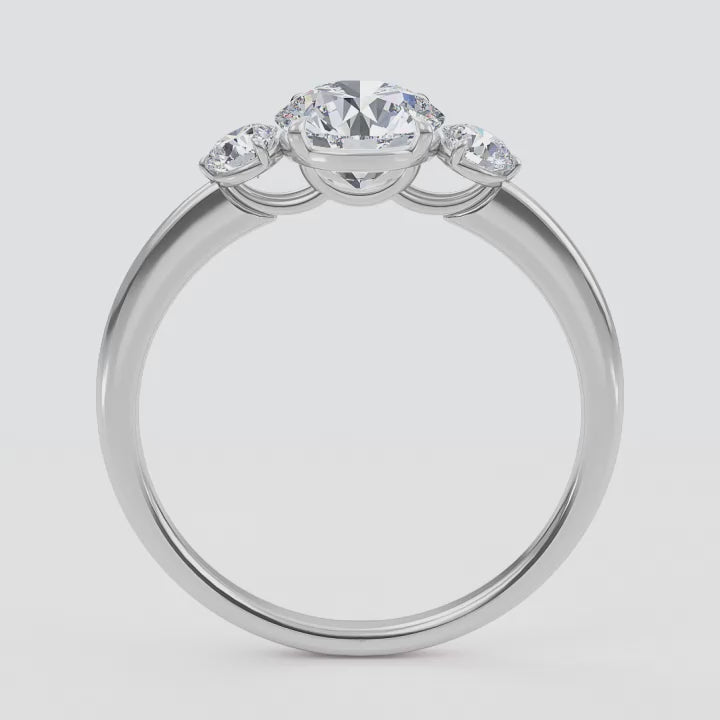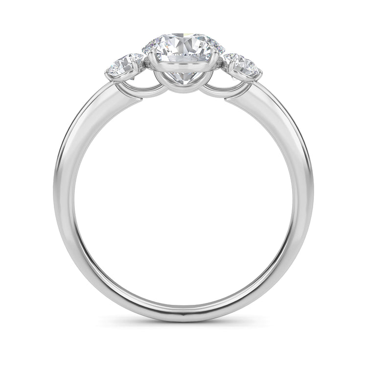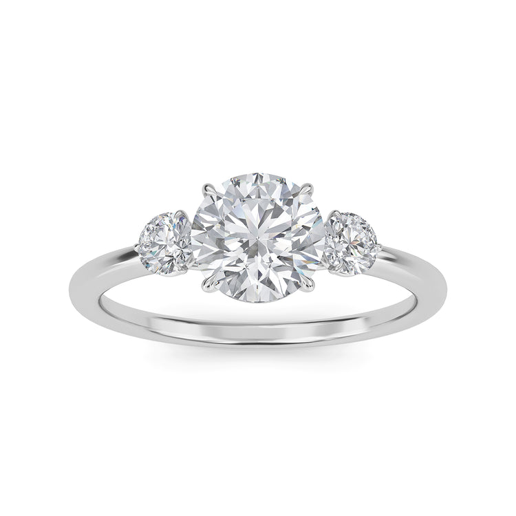 Elegante y elegante, este anillo de tres piedras presenta dos detalles de diamantes en forma redonda junto con una gema central acunada por lustrosas puntas de garra. La banda elegante y sofisticada se estrecha suavemente hacia abajo en una cúpula baja para mayor comodidad.