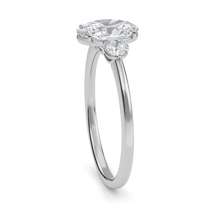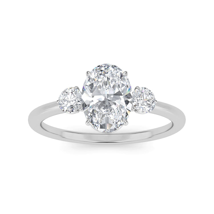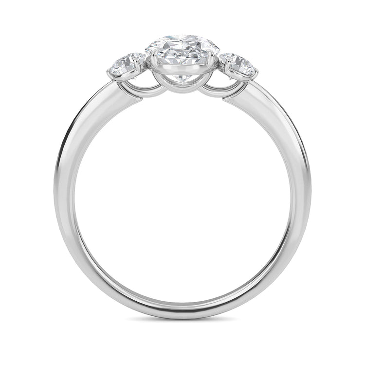 La sencillez clásica define este delicado engarce, que presenta una delgada banda de metal precioso que se estrecha suavemente hacia un detalle de diamante de forma ovalada en cada lado de la gema central.
