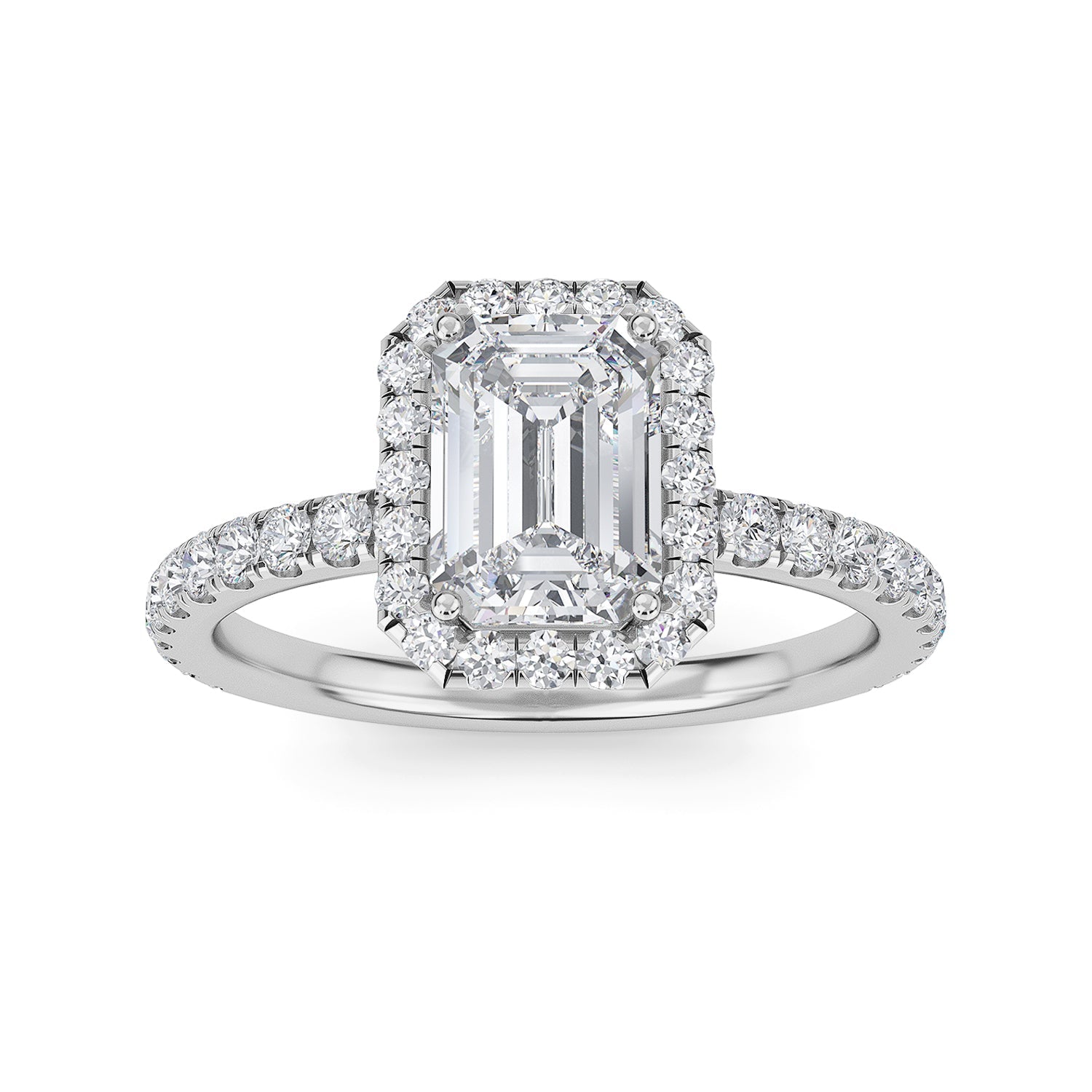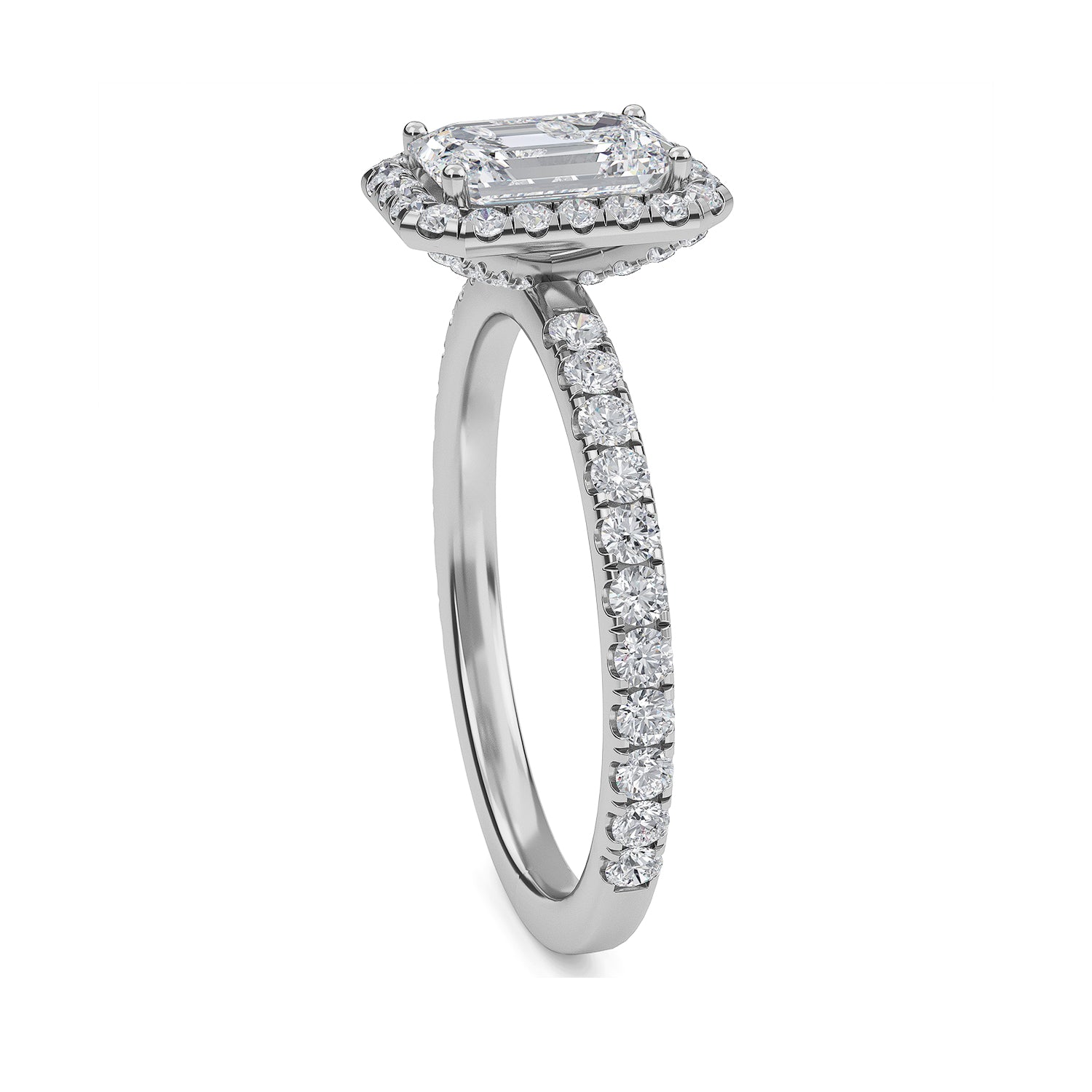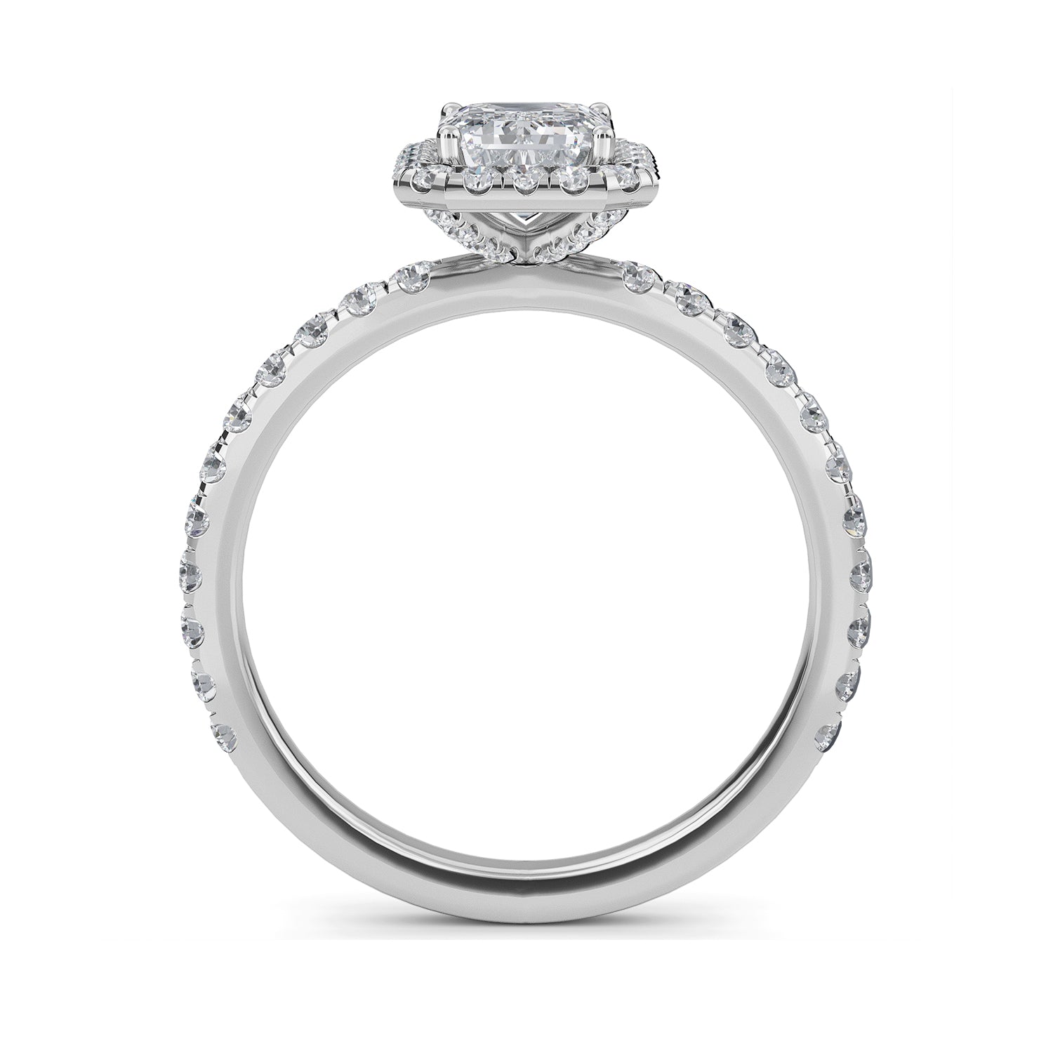 Ce sertissage halo étincelant présente de magnifiques diamants pavés festonnés qui encerclent la gemme centrale et ornent l'anneau. Une galerie incrustée de diamants rend cette bague vraiment spectaculaire.